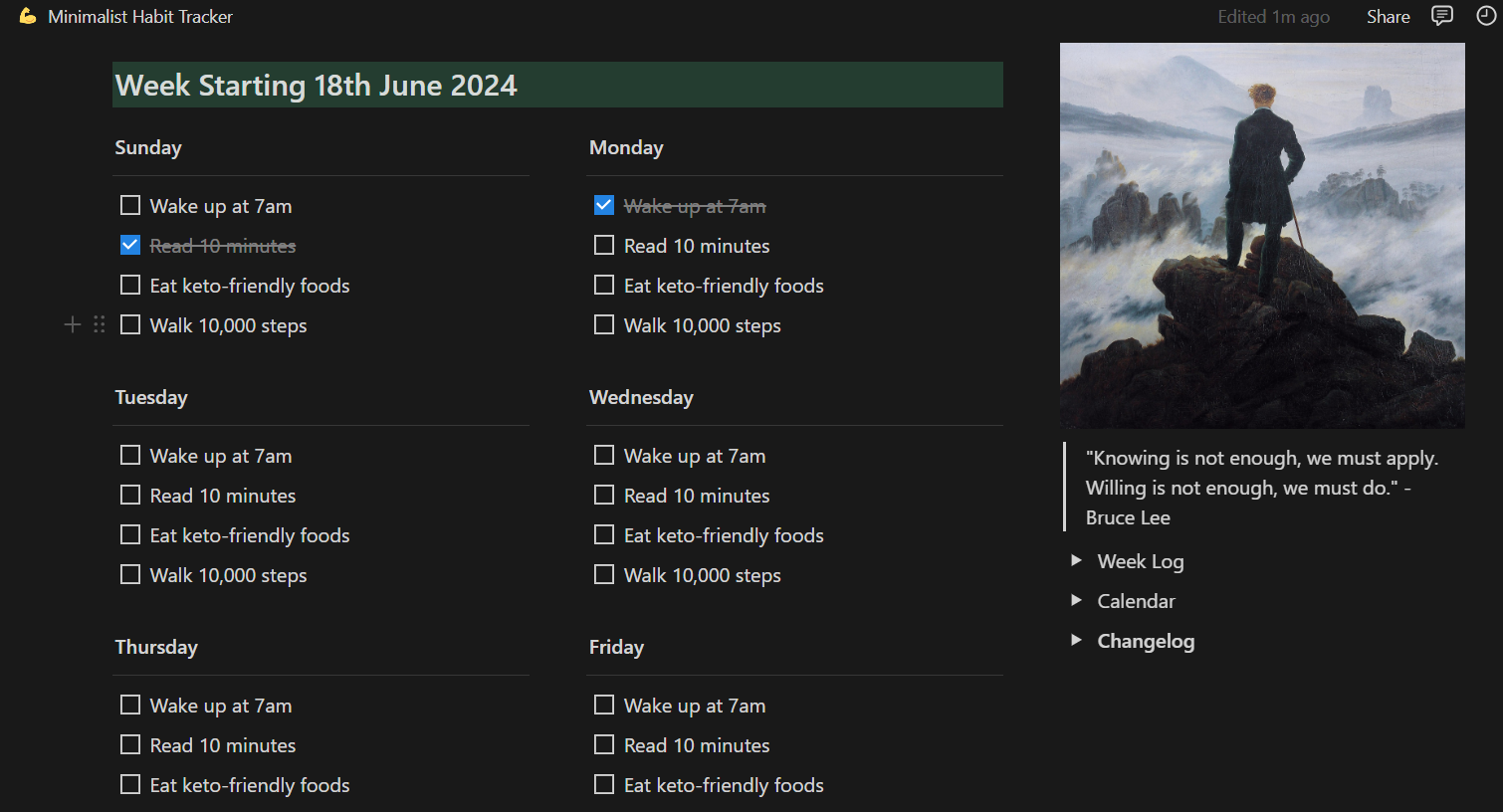 The minimalist habit tracker I use is a Notion template developed by YouTuber and Notion expert Thomas Frank.